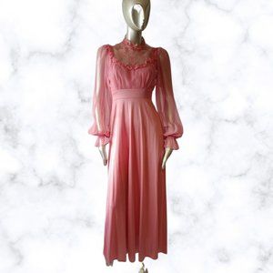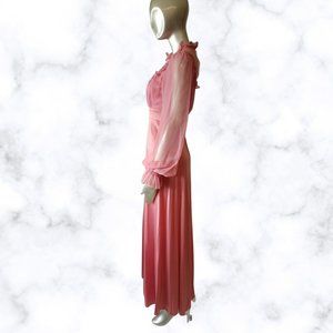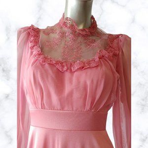 70s Semi Sheer Embroidery Mesh Lace Neck Rose Gold Pink Prom Formal Dress Size 6 From front only Chest--15.5 Waist--12 Shoulder to hem--54