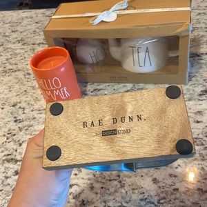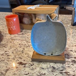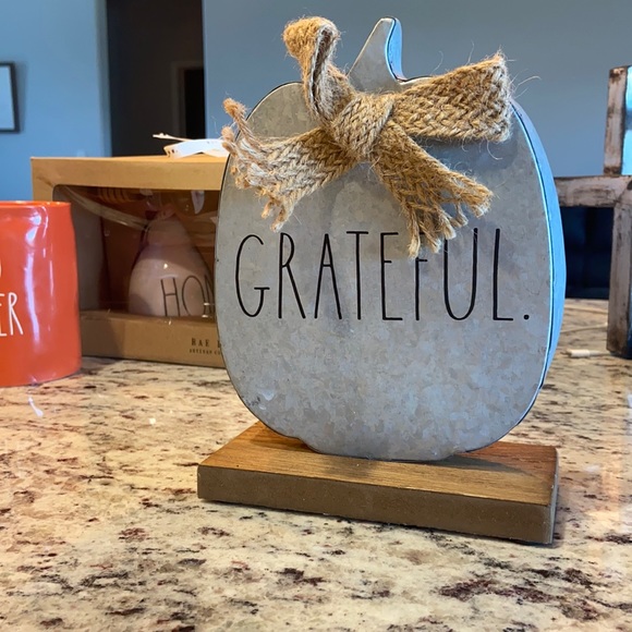 Rae Dunn grateful tin pumpkin on wood base with burlap bow. Bow can be straightened but I’m allergic to burlap so .. yeah. Again a gift when I decided to decorate in Rae Dunn now that I’ve changed my mind it must go !