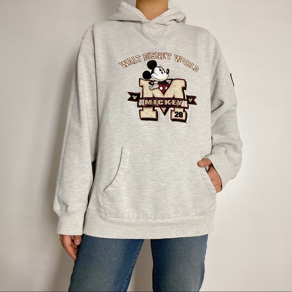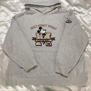 Walt Disney World Mickey hoodie sweatshirt. Heather grey pullover with mickey 28 embroidery on front and a small patch on left arm. Boxy fit. Good preloved condition with normal signs of wear.