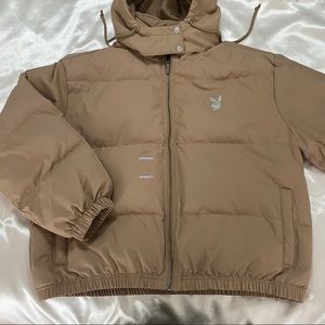 Playboy X Pacsun beige brown puffer jacket. Features boxy fit, drawcord hood, stand up collar, zipper closure, and silver playboy logo on left chest. Comfy and very cozy. There's a couple of stains shown in photos, barely noticeable in person tho. Overall in good preloved condition.