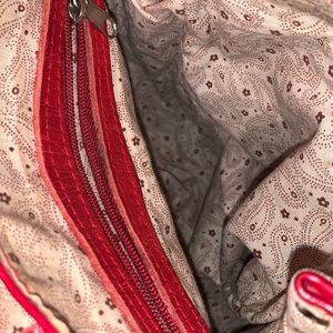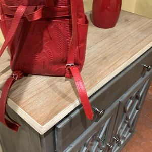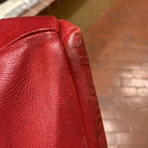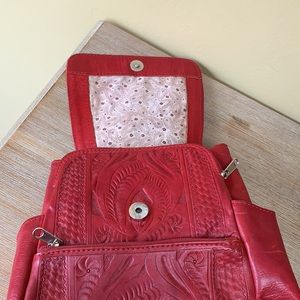 This mini backpack has six compartments. In good condition inside and outside. Inside lining is clean. There are wear on the bottom corners of backpack. The fasteners are upside down and is probably hand made.