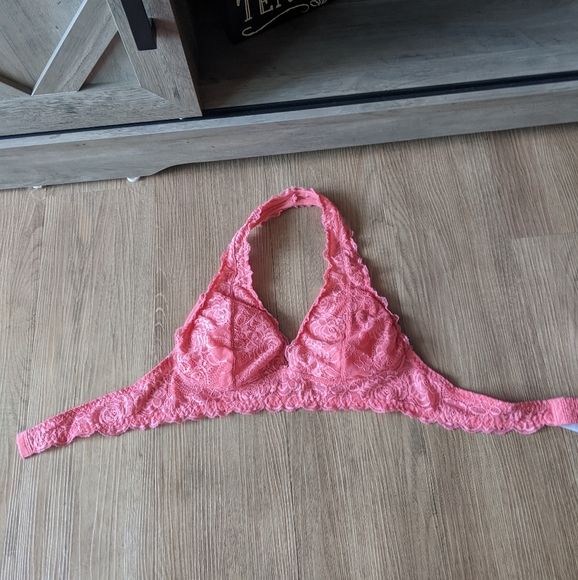 Free Press Coral Pink Halter bralette. Has a floral lace design. It is in fairly good condition, there are a few loose threads on the inside lining of the bralette, but not noticeable when wearing.