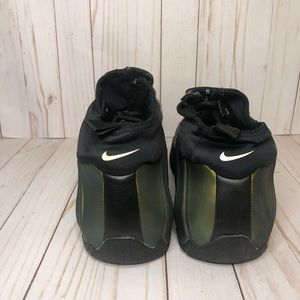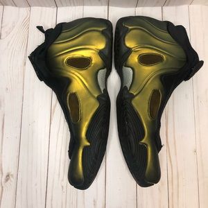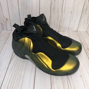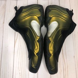 Description: Metallic gold Nike flightposites size 10. Replacement box included, these sneakers are in 8/10 condition as they show general signs of wear including slight sole separation around the edges of the soles.