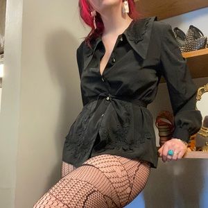 Victorian Goth Harajuku Style Blouse. This is such a fun versatile top. I’m pretty sure the tag is in Arabic... if anyone has any info please DM. I’m super curious. This has a chic collar with lovely lace detailing all over. Flashy gold buttons and tie in the back to snatch the waist. Just a wicked unique piece. Style with schoolgirl skirt and platforms. Lolita as fuck. Definitely for a medium or large. #goth #mallgoth #victorian #punk #fairy