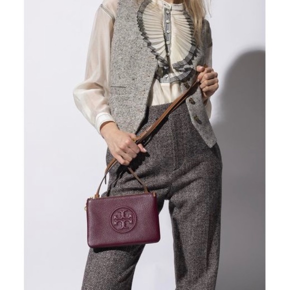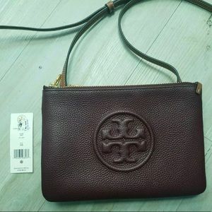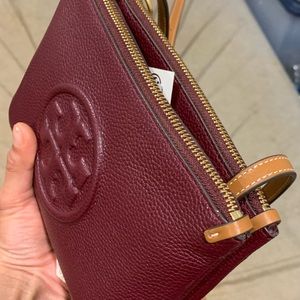 The Perry Bombé Crossbody is made of rich pebbled leather with an embossed Double T. It has a secure double-zip closure and an adjustable contrast-color strap.