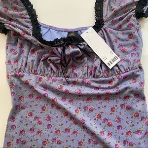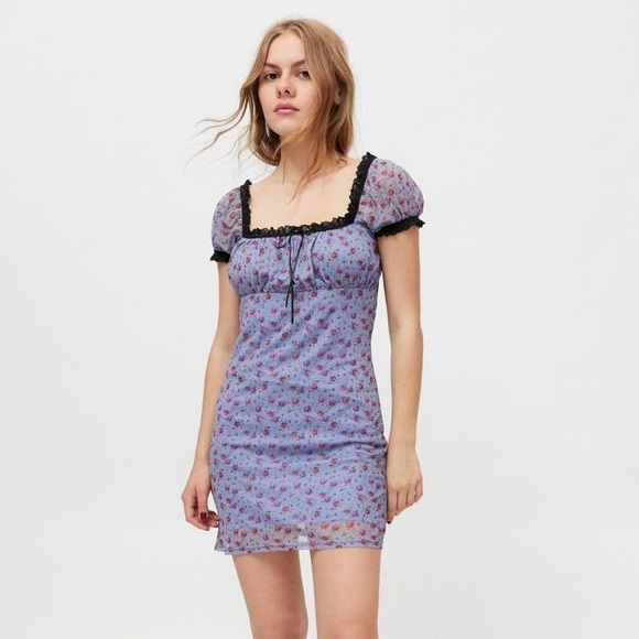 Cottage fairy floral mesh milkmaid dress by Urban Outfitters. Gorgeous purple mini dress with black lace trim, non-functional tie at neckline, and all over ditsy flower print. Mesh overlay with stretchy lining inside. Please note that the hem at cuffs is not elastic. Brand new with tags on, no flaws.