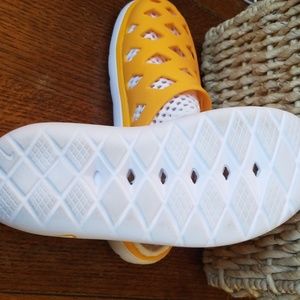 Your tired feet will thank you with the Nike Rejuvin8 slip on shoe. These mules were made to function as a recovery shoe. The lightweight mesh upper is idea for proper ventilation, while on the full length Air cushion system provides for a soft step- making this a solid post work out shoe. But don't stop there! Wear them for anytime you will be walking, running errands, or getting tiresome work done. Try these Nike Rejuen8 for a day of comfort and support. -floor model, dust on bottom, tried on