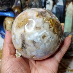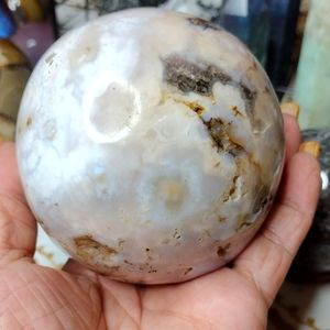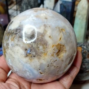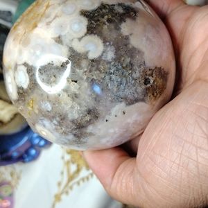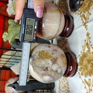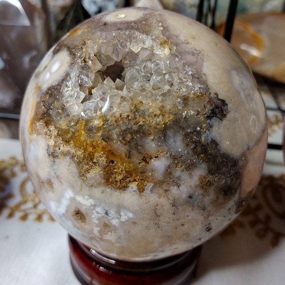 Genuine moss agate sphere with natural druzy caves, large moss patterns. 82 mm