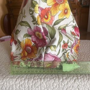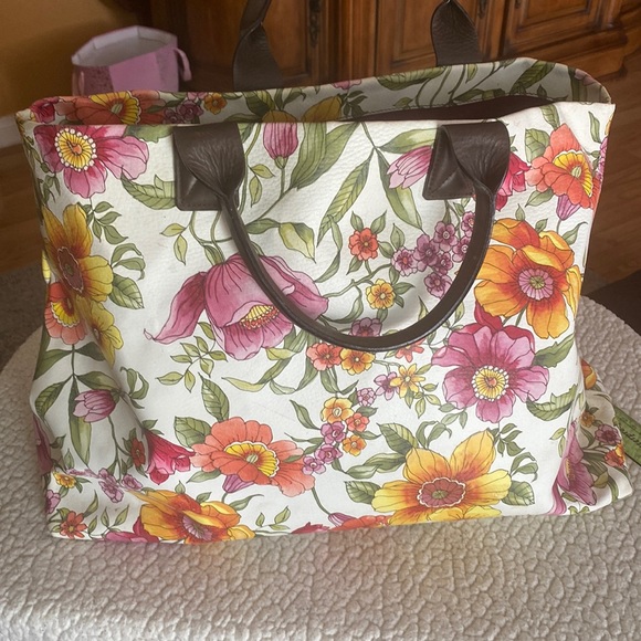 No stains outside, there are stains inside that can be cleaned, good for the park or beach, maybe a overnight bag ! Handles are brown all man made material that I can tell. The bag itself feels like a coded cotton material.