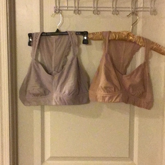 Preloved Aerie Sports Bras Lilac and Light Peach. Has lace around the shoulder straps. Waist 15.25”. Body 90% Cotton 10% Elastane. Lace 90% Nylon 10% Elastane. In GUC. No stains or markings or discoloring of fabric. Size XL