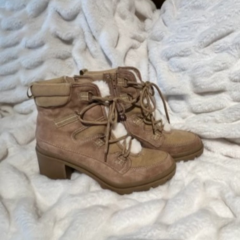 JELLYPOP CAMEL & CREAM LACE-UP BOOTIE 3” BLOCK-HEEL FAUX FUR ACCENTS SZ 9