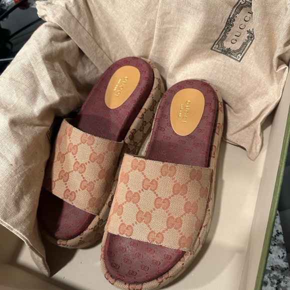 This is a pair of USED Gucci slides in the brick color way. I purchased these from Nordstroms last year. They have signs of use in the toe bed and bottom of the soles (see pictures). I have wiped them down but I will leave further cleaning to the new owner. Will come with original box and flannel bags.