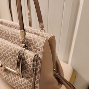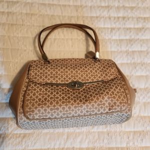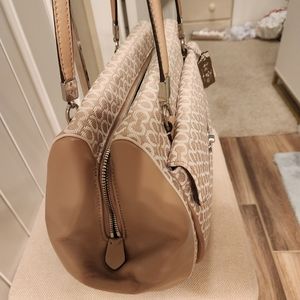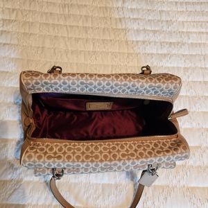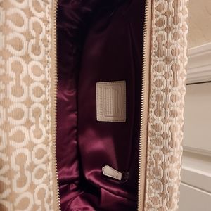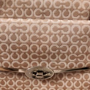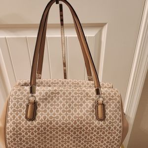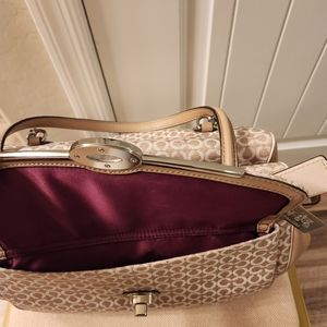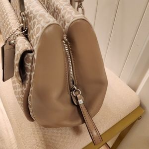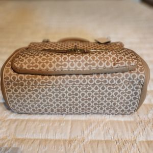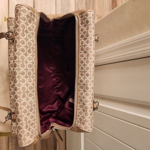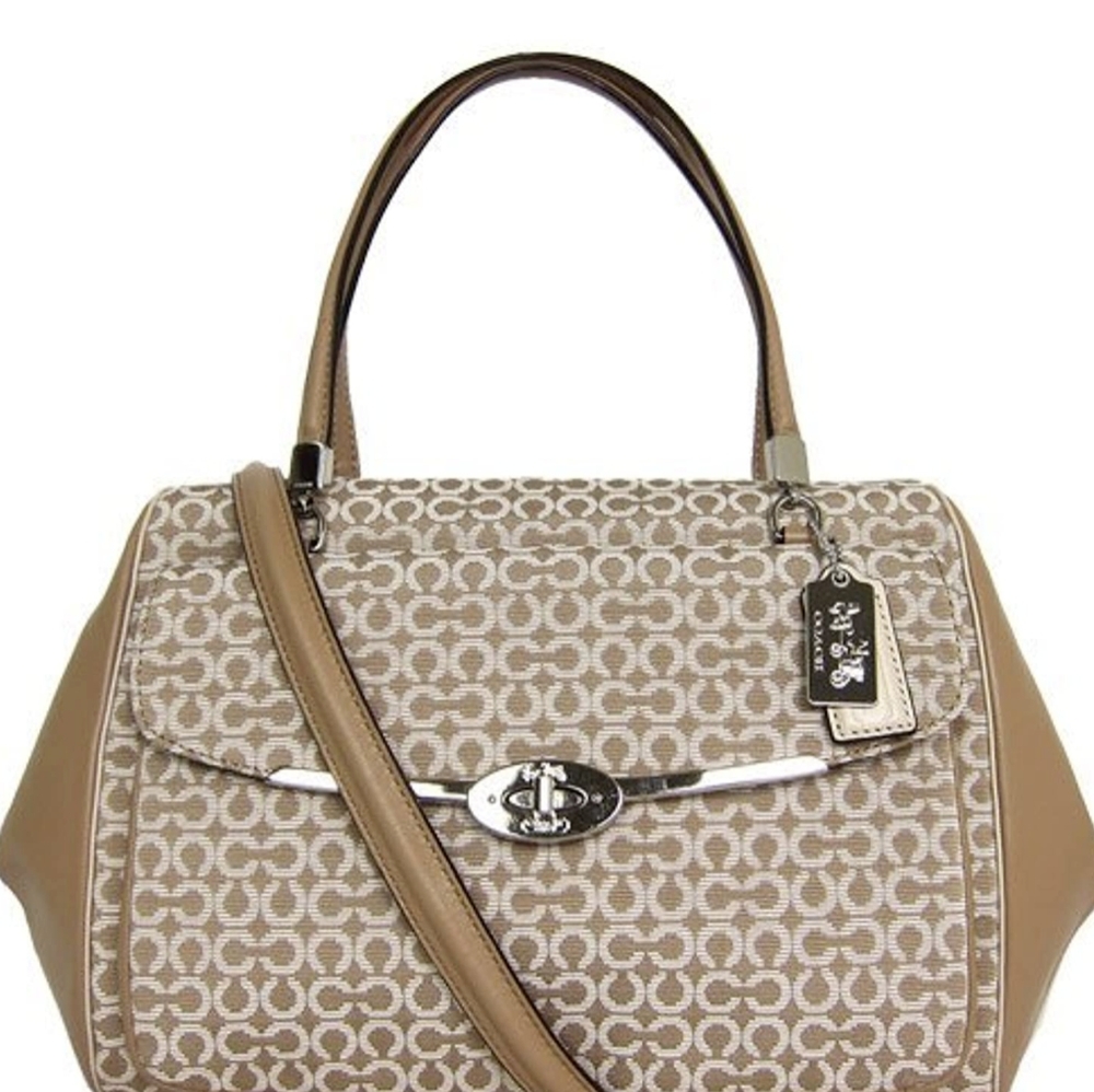 Large Coach Madison Madeline Shoulder Bag Khaki (fabric material with mixed leather) 9 inches H × 5 inches D x approx 14 inches L x Strap 8 inches Drop beautiful lining inside (burgundy color) in good condition slightly used looks brand new