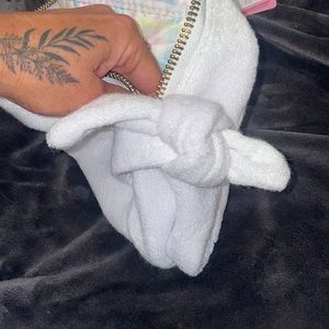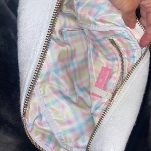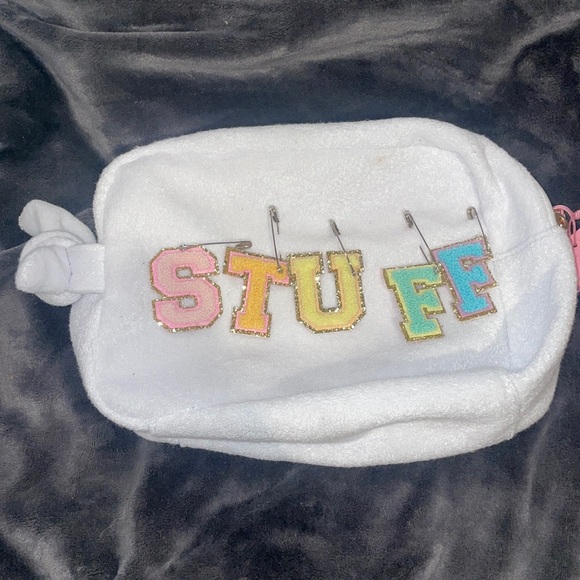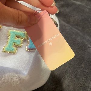 Beautiful NWT bag with the Stoney clover letters. The bag was originally $20 and each letter for $5 so I paid $45 total for the bag. I have not yet secured the letters on to the bag so you can do it however you want! There are two faint marks in the bag as shown in the last picture. Very substantial size. Perfect for large make up back or toiletry bag.