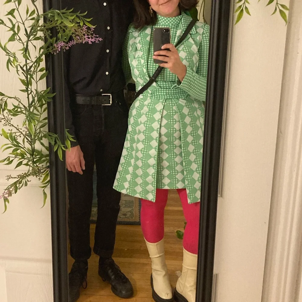 Vintage 2 Piece set. 60s. No brand tag but size tag is 13. Missing 1 clasp to secure the neck and one clasp on the overcoat. Easy fixes..