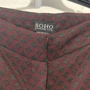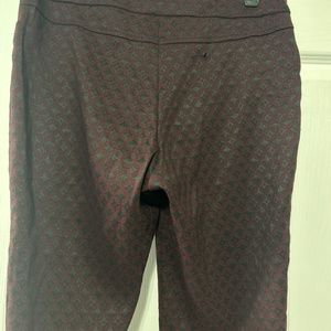 Burgundy and black print pants. Size 8. Stretch material, 39” in length from top to bottom.