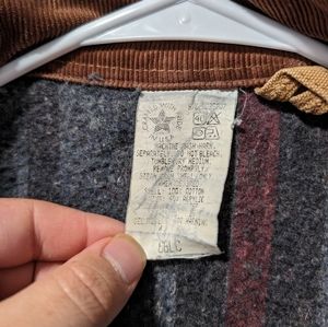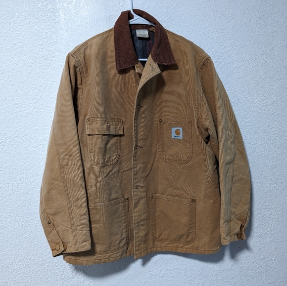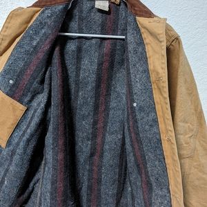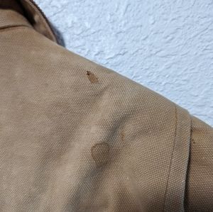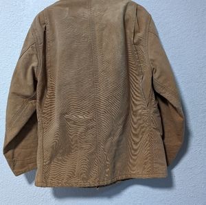 Stay in style with this Vintage Carhartt jacket. It is blanket in the inside and tan on the outside. flaws it has a small stain in the back that will need to be treated. Unfortunately it does have a smell of tobacco. I do recommend a deep oxy and a smell treatment. but other than that this jacket is flawless.