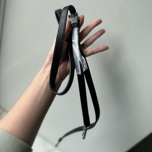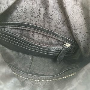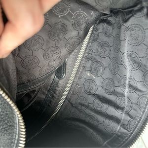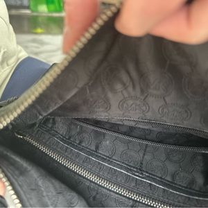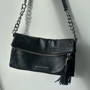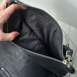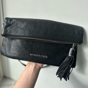 Black Michael Kors hand bag. Comes with longer carry strap to be worn as a shoulder bag. Cute fold over design with zip closure.