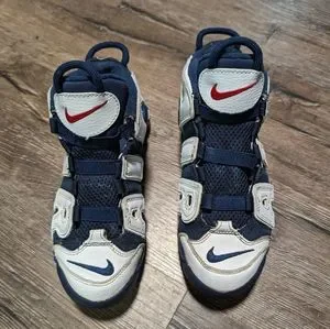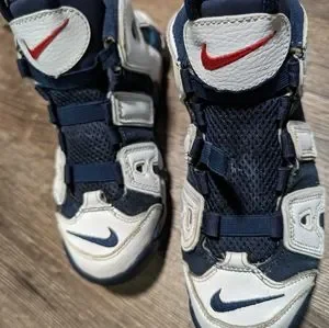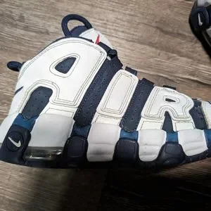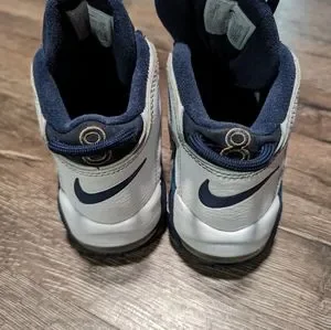 Step up your kid's shoe game with these Nike Air More Uptempo sneakers in blue and white. These athletic shoes feature a high-top shoe shaft style with a tie closure for a secure fit. The flat heel height makes them comfortable for everyday wear and perfect for basketball performance.