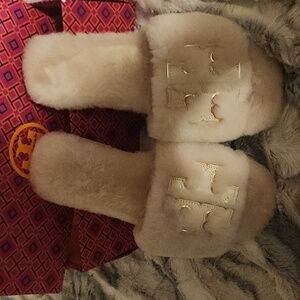 tory burch slippers. size 5 1/2 hard bottom slippers for outside. these are used but in great condition. comes with box retail 198.00