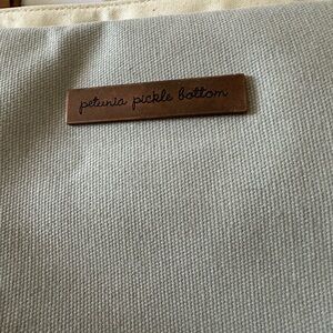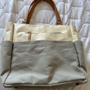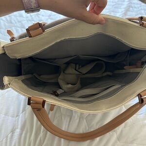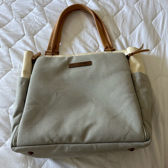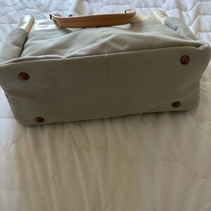 Perfect diaper tote bag with a Small flaw (small lash on the bottom of the bag). The handles are leather feel no flaws. Feel free to offer