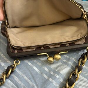 Beautiful Genuine Coach purse bag , new with tags ! Small purse that fits a lot for its petite size with many compartments . Light brown coloring . 10 inches long , 4 inches in width ,6 in height.