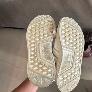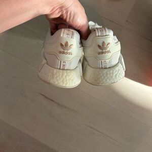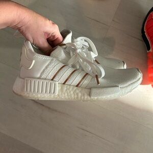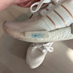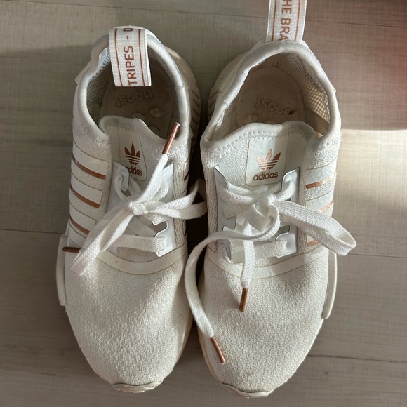 White and rose gold. Has a blue mark on one side. Fit like a 6.5 these run big!