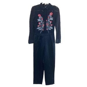 HOPE & IVY BLUE LACE EMBROIDERED LONG SLEEVE PANT JUMPSUIT, SMALL, ZIPPER CLOSURE.