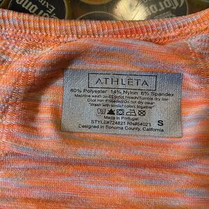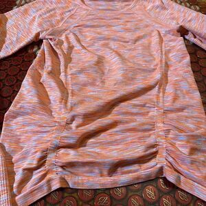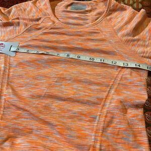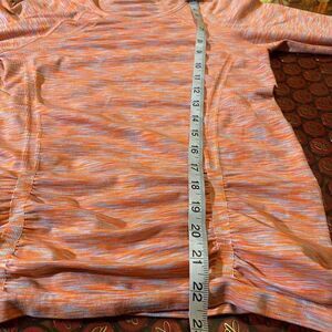 Elevate your activewear game with this Athleta Fastest Track Tee. The space dye pattern in vibrant orange color is perfect for any workout, whether it's yoga, running or gym training. This T-shirt has short sleeves and a pullover closure for comfort and ease of movement. The ruched long sleeves add a stylish touch to this activewear top.