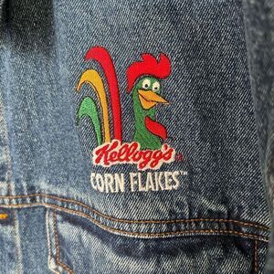 This vintage Upstream jacket is a must-have for any fan of the 90s, Western, or cowboy style. The mid-length, blue denim jacket features a button-down closure and all-season features such as leather collar, collared style, and pockets. The Kelloggs Corn Flakes embroidered logo adds a touch of uniqueness to the jacket, making it a great addition to any collection.