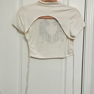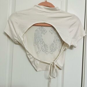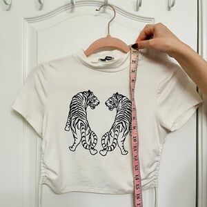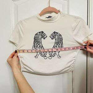 Mock neck top with tigers. Measurements shown in pictures. Stretchy.