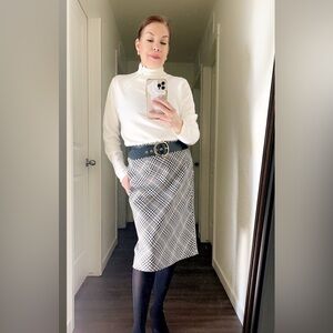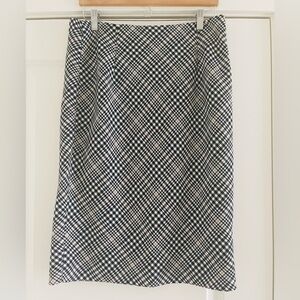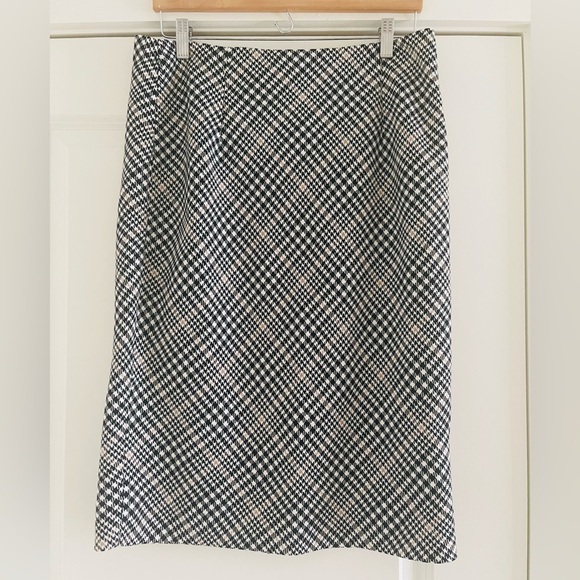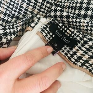Houndstooth pencil skirt with back zipper and hook on the back. Color: black/white/tan. Good condition. Belt not included.