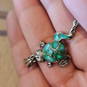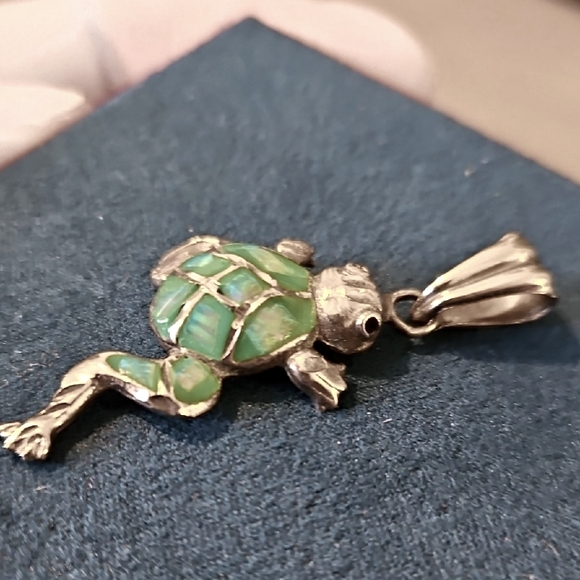Charming turtle pendant with bluish-green lab opal. Perfect for adding a touch of nature to your jewelry collection.