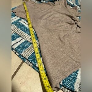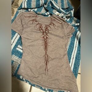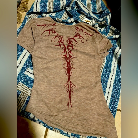 The leading photo in this listing is of the back of the shirt. It’s an outline in burgundy of your spine up to your blades. Printed on a heather brown fitted tee. No tag no brand. I’m going to say this is an extra small.’ The right side of the shirt is gathered in its linning to bring some swag. It raises the right side a couple inches.