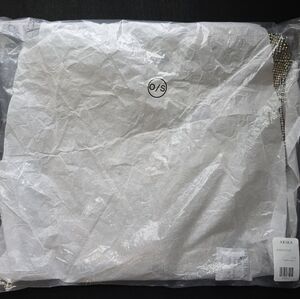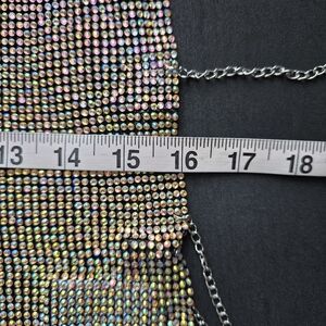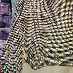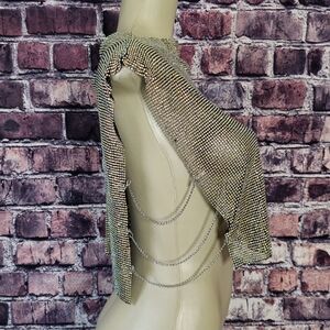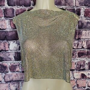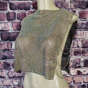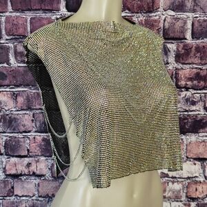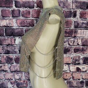 Paragon Rhinestone Chain Mail Top. It features a semi flexible unlined rhinestone link construction, a pull over design, a sleeveless silhouette, a cropped length, a mock neckline, open sides with adjustable draped chain links, a plunging accent at the back with a trio of adjustable chain closures, and statement color-shifting AB embellishments.
