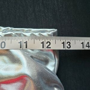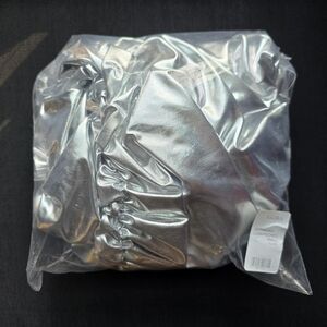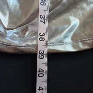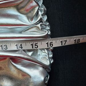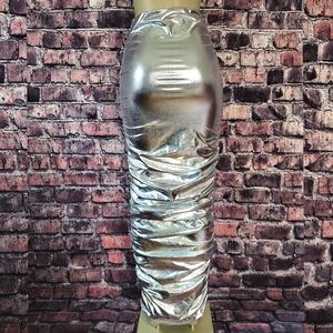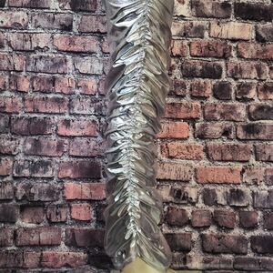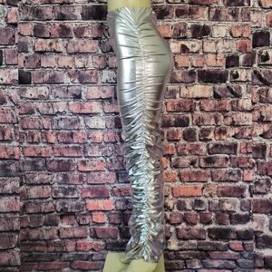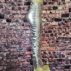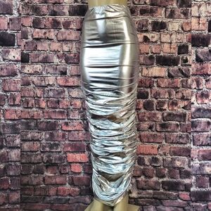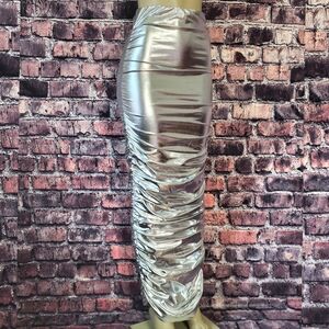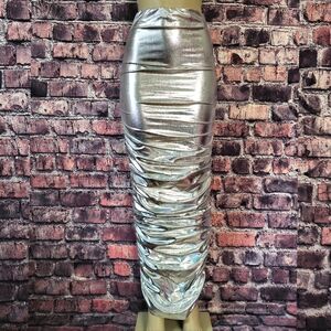 Luna Ruched Metallic Siler Mermaid Skirt. It features a semi stretchy construction, a high-rise design, a cinched elasticized waist, maxi length, statement metallic coloring, and all over ruched detailing. Please note the skirt arrived with a few minor marks in the lining. Please see photos!