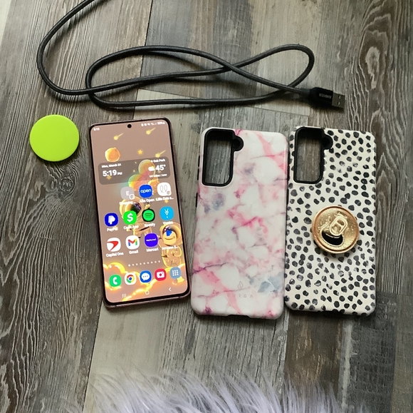 Samsung galaxy s21 5g in rose gold. Has a holographic shimmer effect, explains the color shift, really pretty. Storage is 128gb. Phone is Unlocked and ready for any GSM carrier.