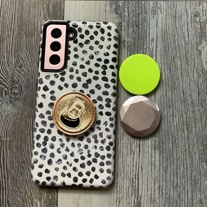 Will include 2 burga cases and 3 used popsockets attachments. I will clean the popsockets but will show discoloration. Also will provide a non Samsung charger cord.