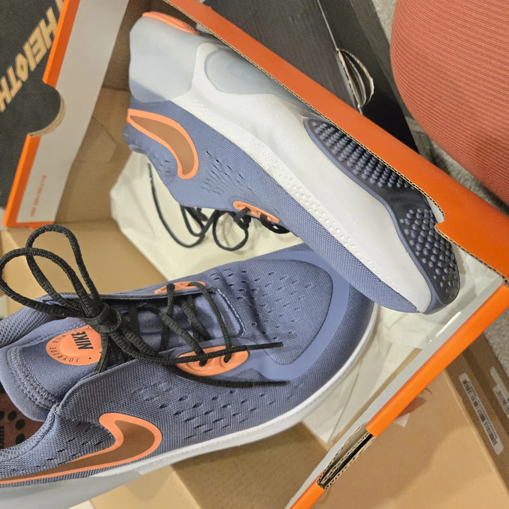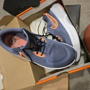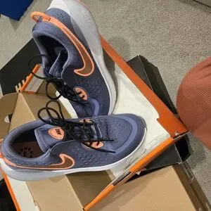 Stylish Nike sneakers in blue with orange accents. Perfect for casual wear.