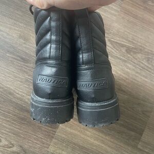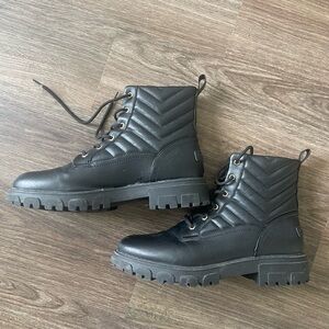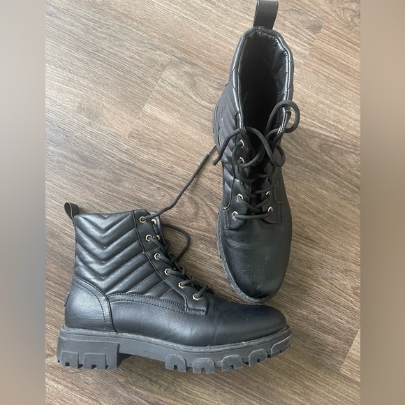These black combat and moto boots feature a distinctive quilted pattern on the ankle shaft, offering a stylish twist to the classic design. Crafted from smooth leather, they boast a durable rubber sole and a lace-up front with metal eyelets for a secure fit. The boots are ankle-length with a moderate heel, combining practicality with a fashionable edge.