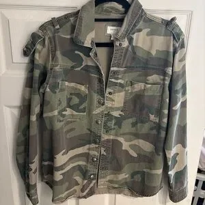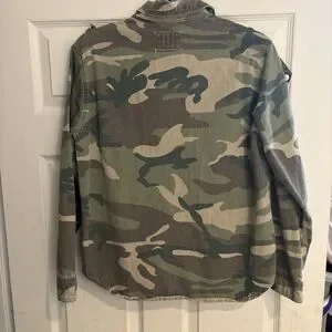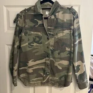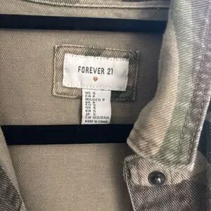 Casual button-up shirt with a green and tan pattern. Ideal for everyday wear.