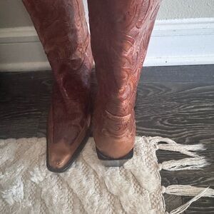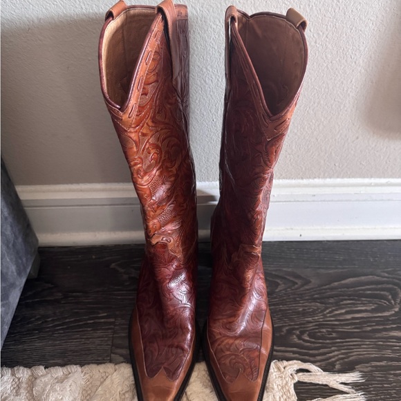 These brown heeled boots feature a sophisticated pointed toe design and a textured leather finish, offering a blend of elegance and rustic charm. The knee-high silhouette and slightly angled heel provide a classic look, while the pull-on style with elastic goring ensures comfort and ease of wear. Crafted with high-quality materials, these boots are perfect for making a stylish statement.