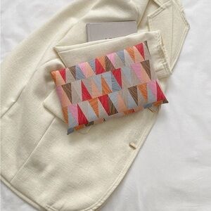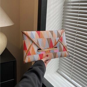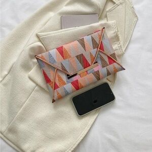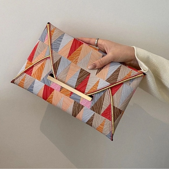 Stylish clutch with a vibrant geometric pattern. Features a mix of red, pink, orange, and brown hues. Perfect for adding a pop of color to any outfit. 100% polyurethane