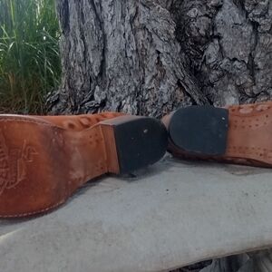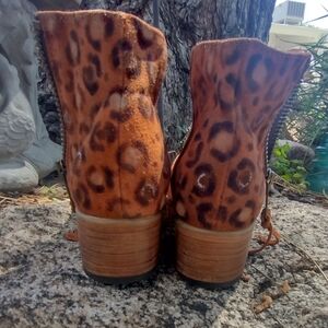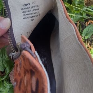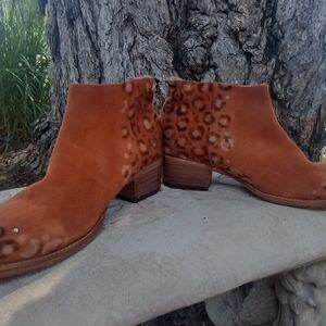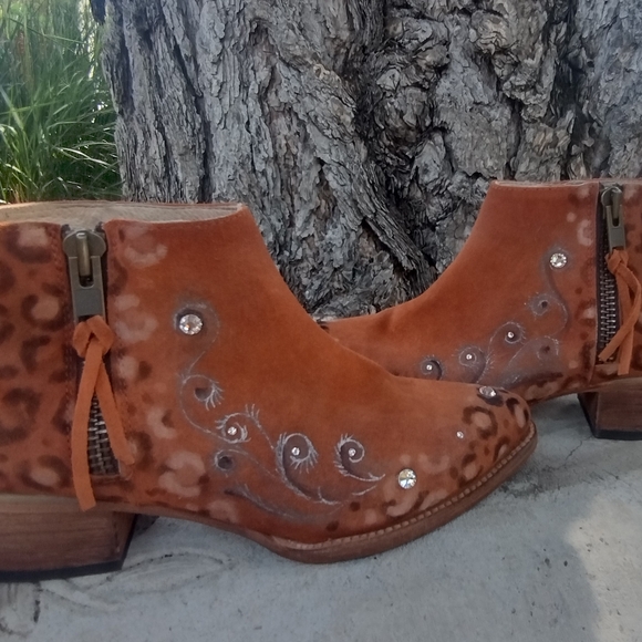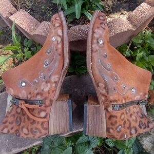 Stylish, one of a kind, genuine suede, size 11 Freebird Onyx boots with intricate decorative accents and bling. Features a warm tan color perfect for adding flair to any outfit. Runs true to size and only worn a handful of times. No box. Last photo is from Freebird but all others are a better representation of the true color of the boots. This style is a retired style so no longer available. The heel is 1.25 and shaft is 5.7"