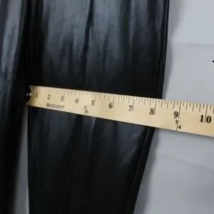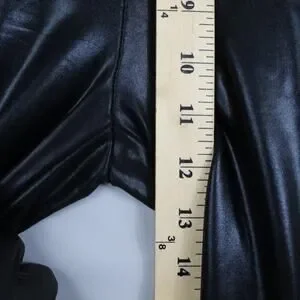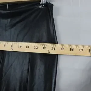 Features a high rise waistband, faux leather look, wide flare leg with front slits at hem