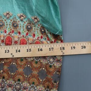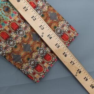 Color: Aqua teal base with red, gold, tan, and multicolor intricate ornate paisley and gemstone inspired print