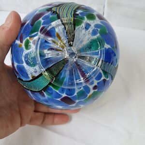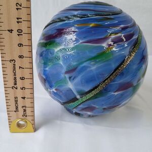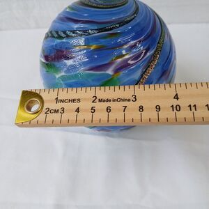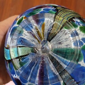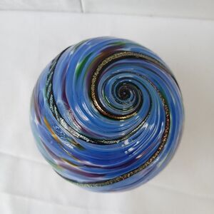 This signed hand-blown textured glass pedestal paperweight is a unique piece of art glass featuring a swirl pattern in multicolored hues. Handmade in the 21st century in Florida, this decorative paperweight is styled in a Mid-Century Modern aesthetic. The glossy finish and incised backstamp add to its artistic appeal, making it a standout piece for any collector or lover of artisanal glassware.