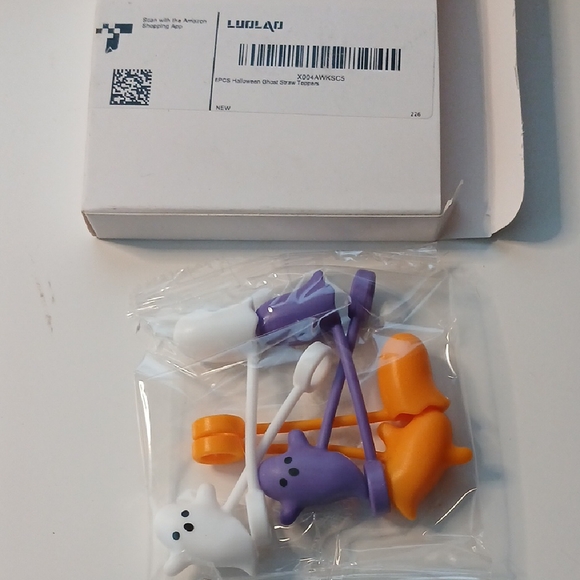 Set of Halloween ghost straws toppers in purple, orange, and white. Perfect for festive drinks.