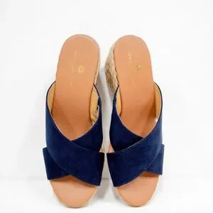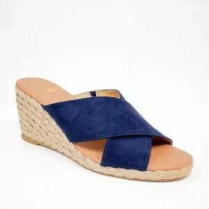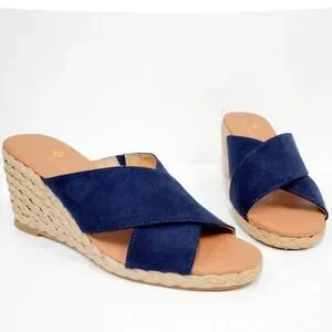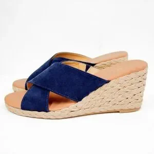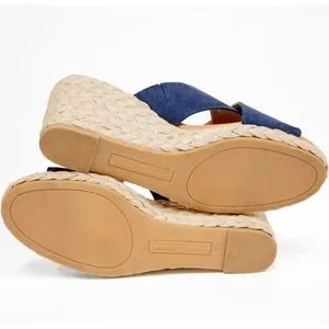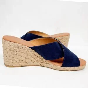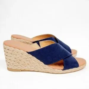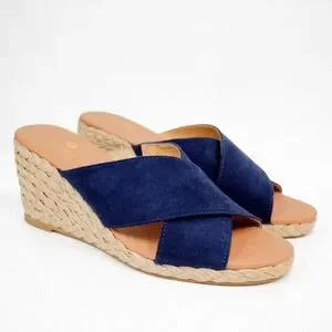 "A lovely espadrille wedge sandal with navy faux suede cross straps and jute-wrapped midsole. 3" block heel and grippy outsole"