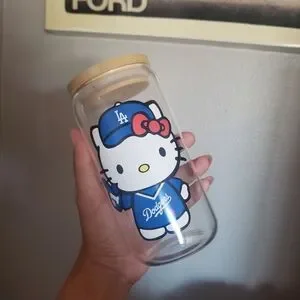 Cute Hello Kitty Dodgers glass jar with a wooden lid. Perfect for fans and collectors.